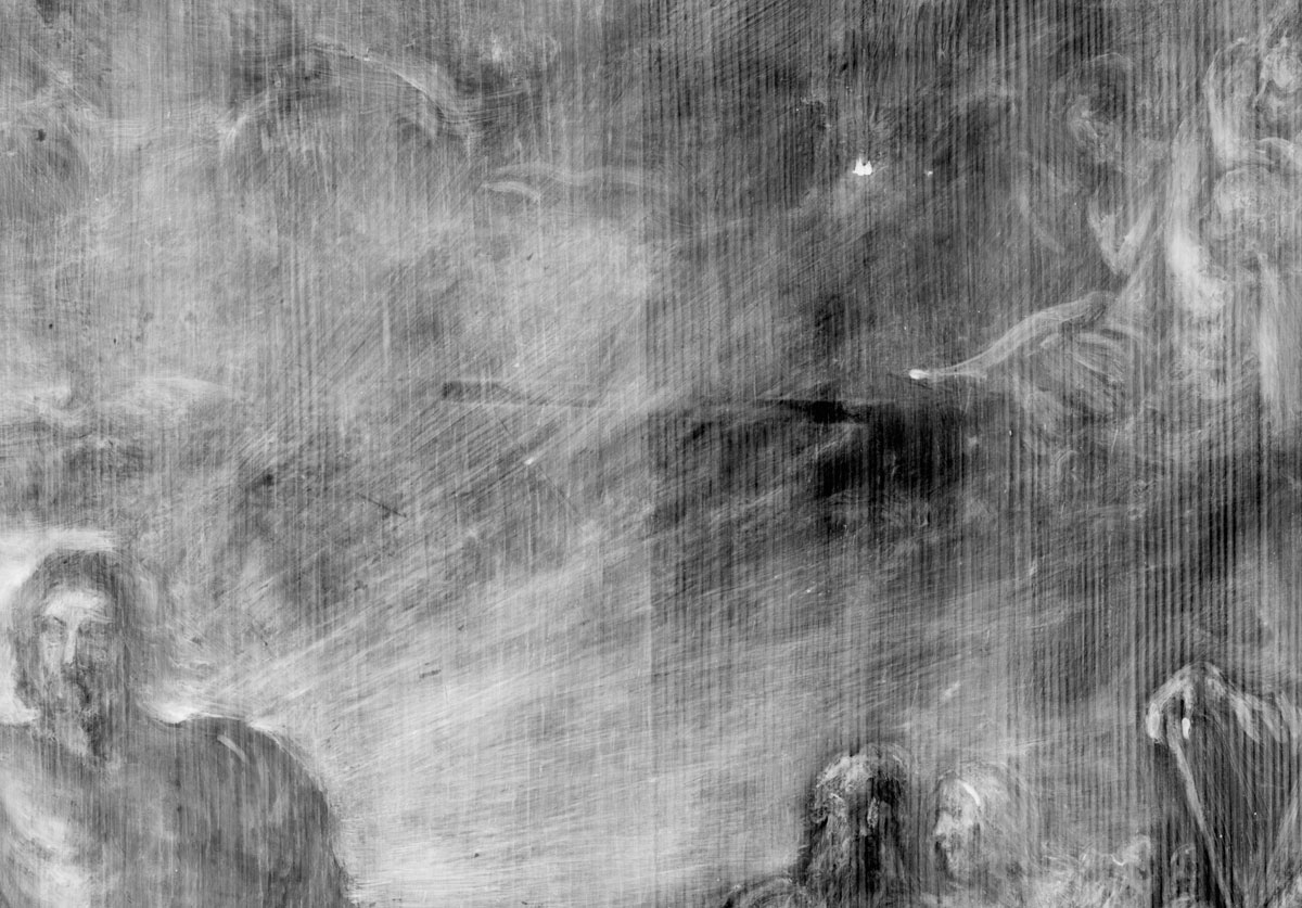 Ausschnitt Röntgenaufnahme: Peter Paul Rubens, Das Jüngste Gericht (Kopie); Malerei mit stark absorbierendem Bleiweiß, sichtbarer Holzmaserung und mittig einem Holzdübel; (Laura Princzes, SKD).